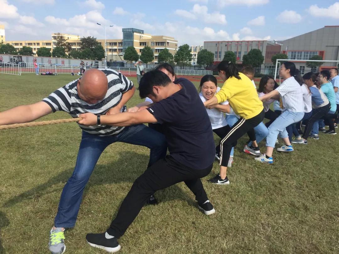 熱身小跑后,員工們抽簽分兩組列隊。一場別開生面的拔河比賽接踵而至。只見雙方隊員腳頂著腳,肩捱著肩,身子鱗次后傾下沉,雙手挽住大麻繩,力道十足好似鐵鉗。