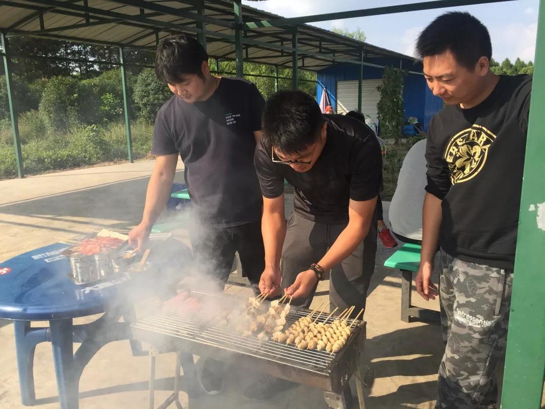 最后一個環節-燒烤便是團建的重頭戲,下午兩點燒烤正式開始。燒烤場中炊煙裊裊,男女分工各司其職,大家把串好的牛羊肉、雞翅、香腸、玉米等食材依次排開,整齊擺在場地中央的四個燒烤用具上,伴隨著炭火燃起的火焰,燒烤產生的香味溢滿四周,讓人垂涎三尺。男隊員擔任燒烤美食重任,女隊員負責打下手、遞盤子、遞佐料……一起享受這歡樂的時光。