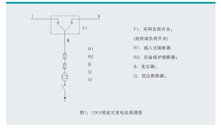 10kV預(yù)裝式變電站的外形及結(jié)構(gòu)見圖2、圖3郵箱分上下(或左右)兩部分,上面為高壓油箱,下面為變壓器油箱,兩者僅電氣連接而又不通。原理圖見圖1,圖中“I”“II”線路為環(huán)網(wǎng)饋電線,“III”支路為變壓器支路,“IV”為低壓輸出。變電站既可用于環(huán)網(wǎng)供電系統(tǒng),也可用于終端系統(tǒng)中,裝換十分方便。“I”“II”線路及“III”支路饋電同環(huán)網(wǎng)負(fù)荷開關(guān)進(jìn)行切換,同時(shí),變壓器高壓側(cè)進(jìn)線端裝有后備保護(hù)熔斷器和插入式熔斷器,用于保護(hù)該支路的短路故障以及過載過溫保護(hù)。同時(shí)還可以安裝高壓顯示裝置及安裝避雷器。變壓器的低壓端通過計(jì)量表計(jì)和低壓斷路器后輸出。